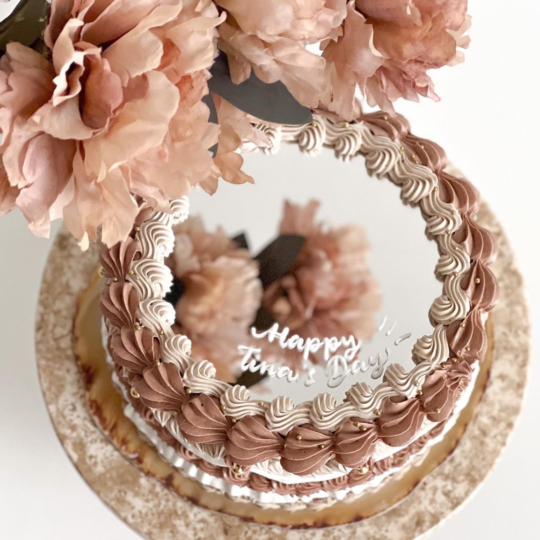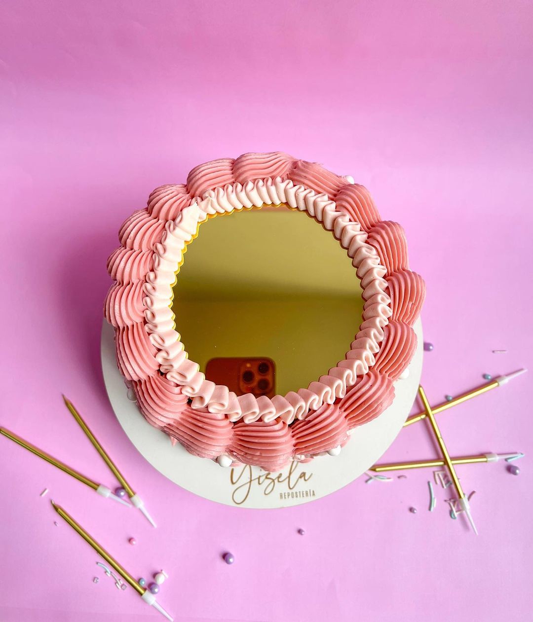 Creo que es una técnica con mucho potencial porque no solo podemos cambiar tamaños, colores y técnicas decorativas, sino que también podemos posicionar el espejo en cualquier cara del pastel, quizás una tarta cuadrada y el espejo en uno de los bordes y no como topper, hay muchas posibilidades por explorar.