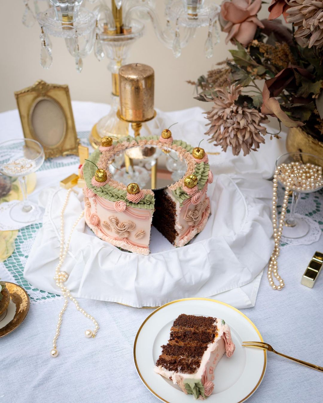 Una de las dudas mas lógicas que surgen es cómo puedo cortar el pastel si tiene un espejo justo arriba y no puedo hacer el corte. Si el espejo fuera mucho mas pequeño que el diámetro del pastel podemos dejarlo hasta el último momento y cortar solo lo que no está cubierto por el pastel, como en uno de los diseños que vimos arriba.